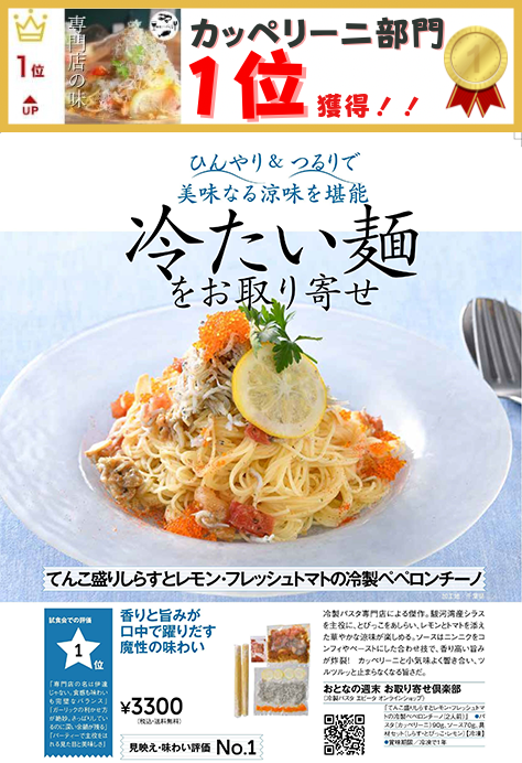 冷製パスタ、カッペリーニ部門1位を取った『てんこ盛りしらすとレモン、フレッシュトマトの冷製ペペロンチーノ』が人気です!