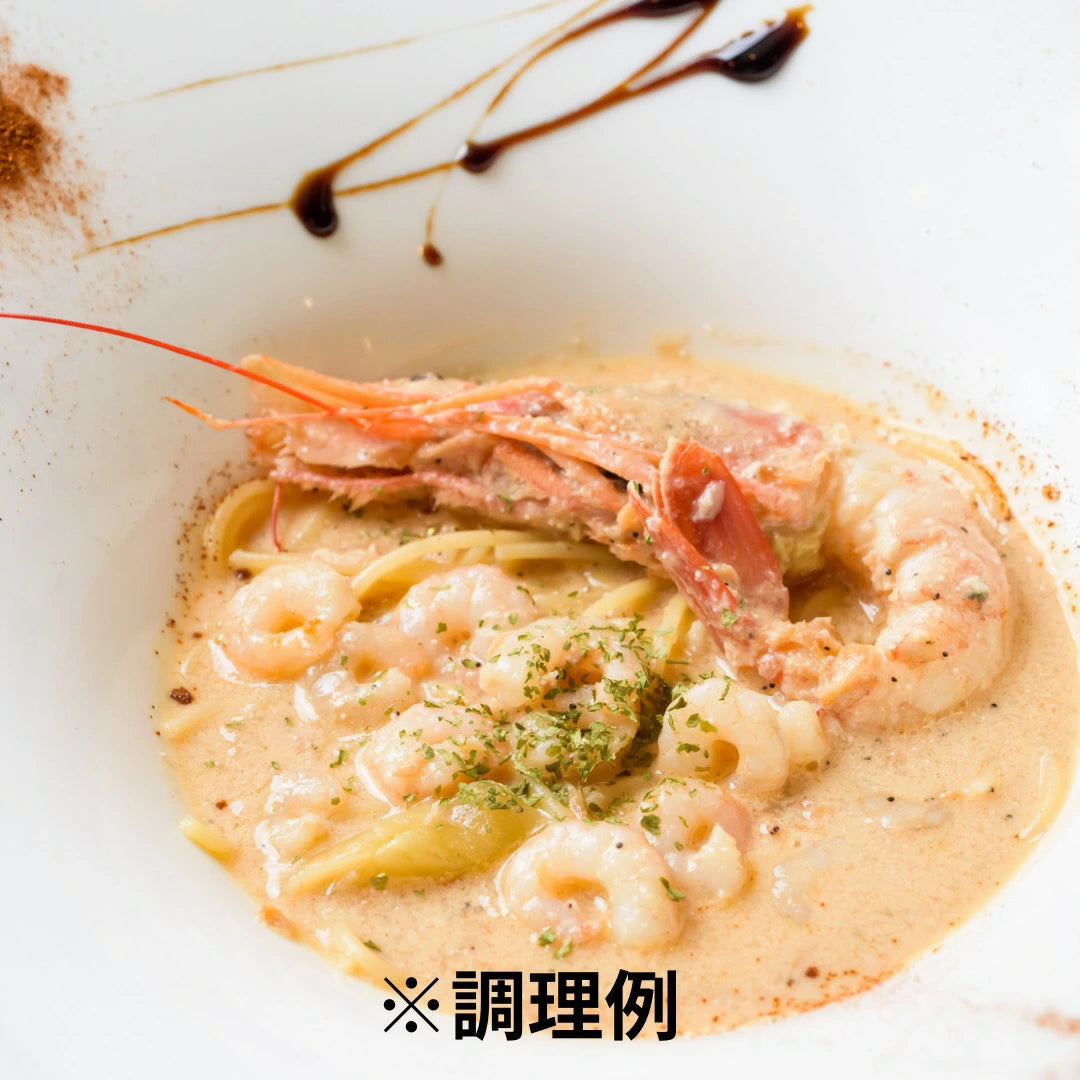 スパゲッティ、赤エビ、ブラックタイガー、明太子、干しエビ、ベシャメルソース(牛乳、薄力粉、バター)砂糖、ニンニク、オリーブオイル、パセリ、玉葱、人参、調味料(アミノ酸等)、香辛料 (一部に小麦粉、乳成分を含む)